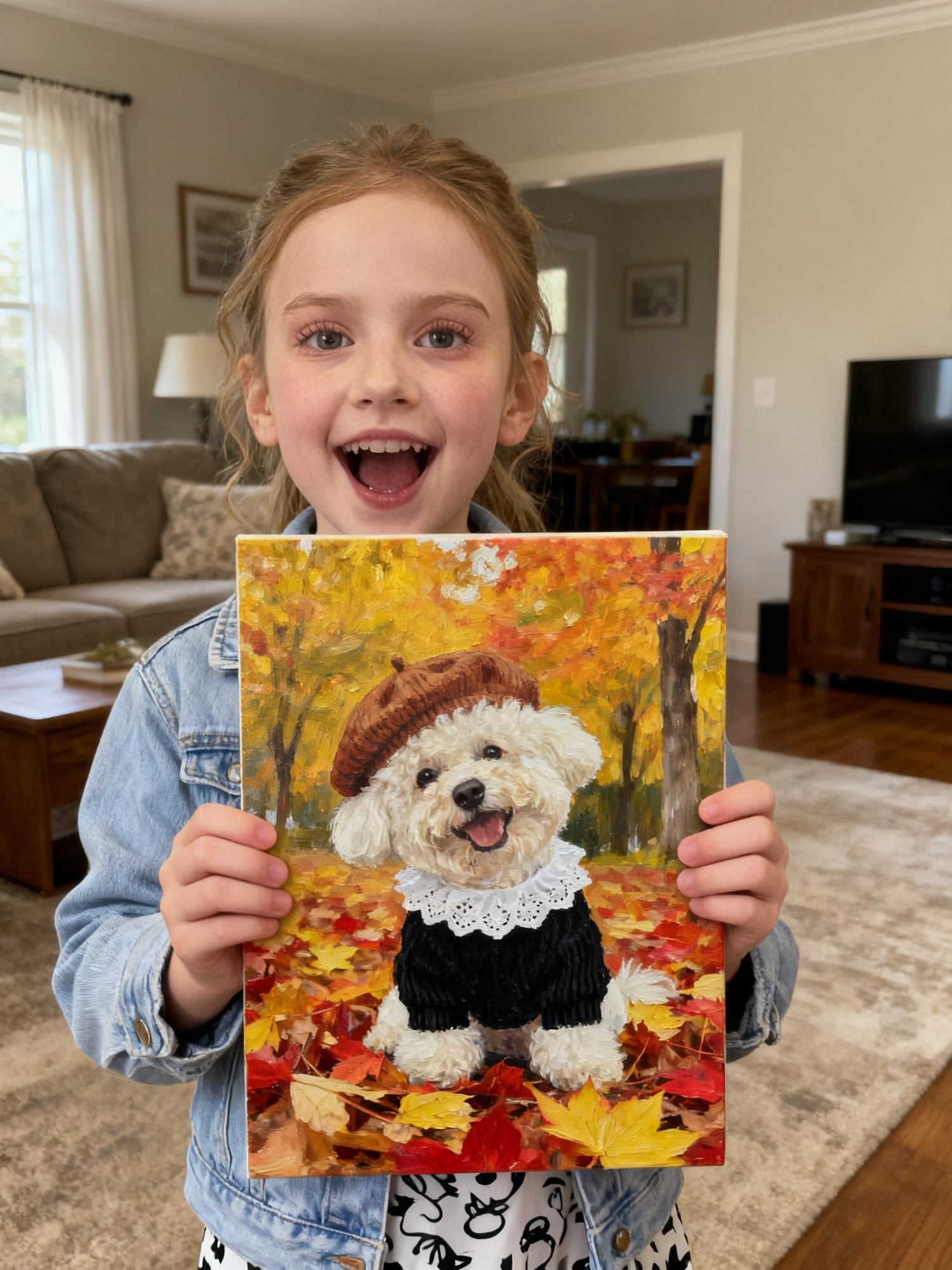We currently offer: Canvas prints (frameless, gallery-wrapped), Framed prints with faux wood frames, Round wooden decorative portraits. We're continuously expanding our product line with more pet-themed accessories and merchandise—stay tuned to our website for new releases