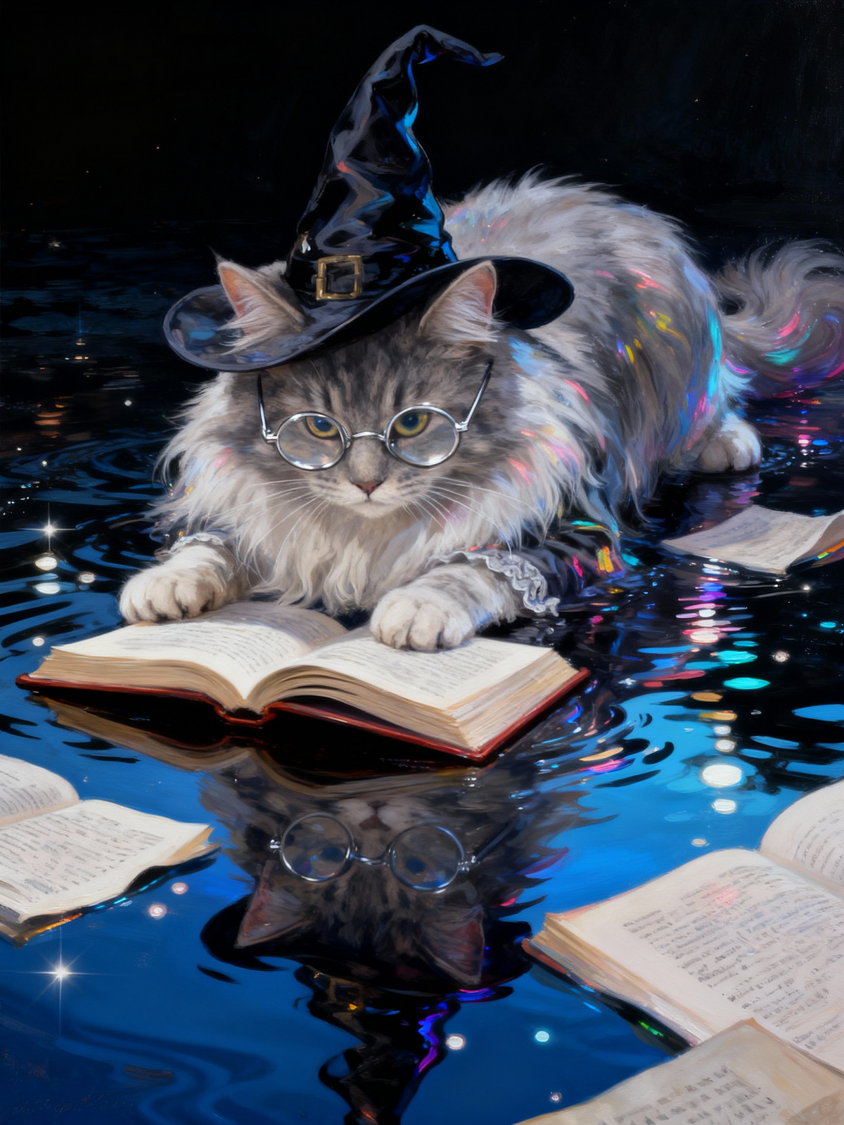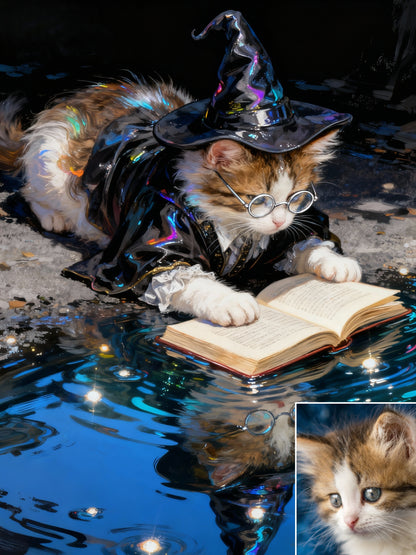 ✨ Unlocking Ancient Secrets. Step into a world of enchantment with "The Arcane Scholar" portrait. Your pet is transformed into a dedicated student of the mystical arts, clad in a shimmering, holographic robe and the iconic pointed hat, poring over a spellbook by the light of a starry reflection pool.