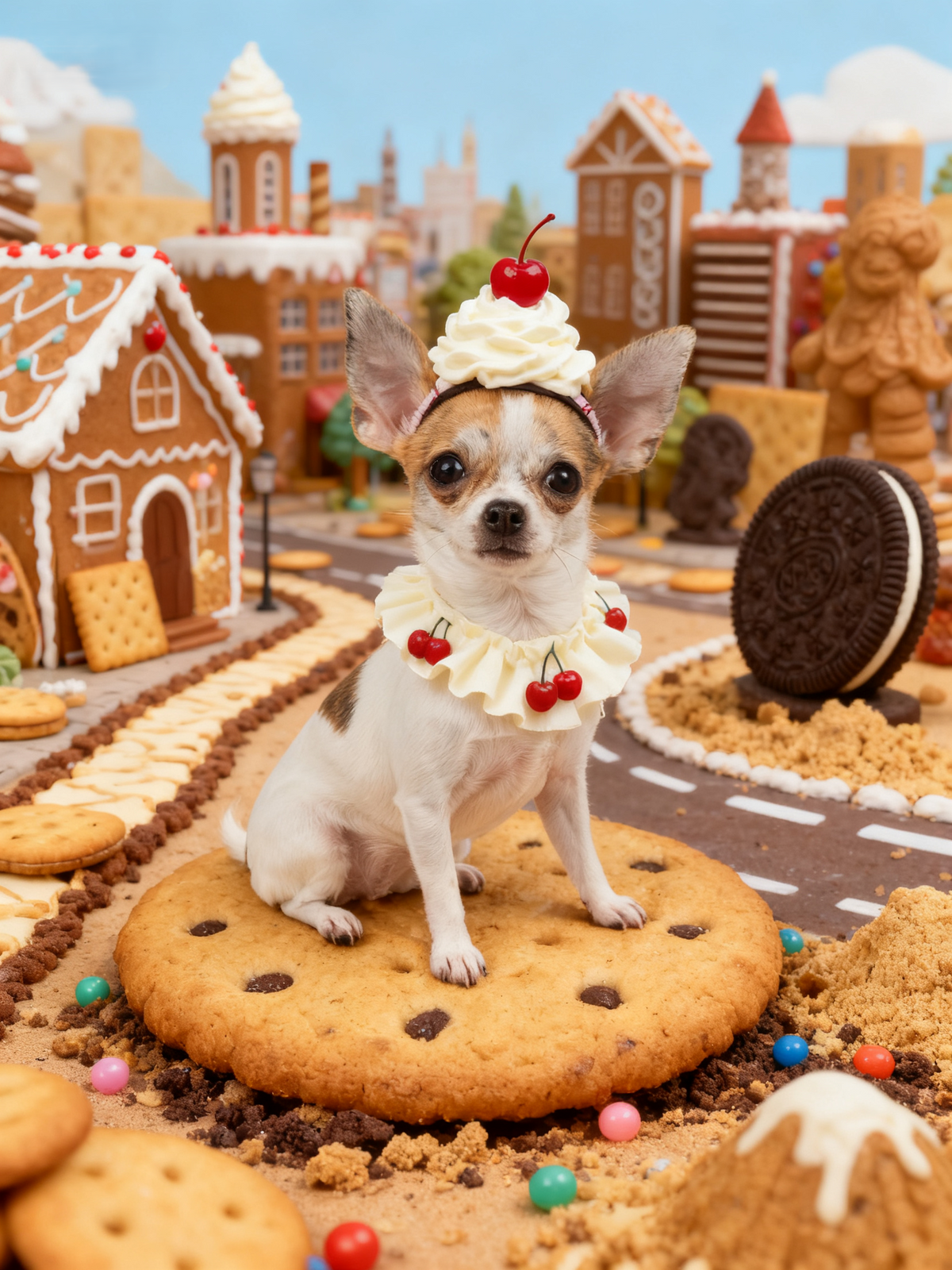 👑 Welcome to the Sweetest Realm on Earth! Enter a world where every road is paved with crackers and every building is a masterpiece of gingerbread and icing. This portrait transforms your pet into the charming sovereign of "The Confectionery Kingdom."