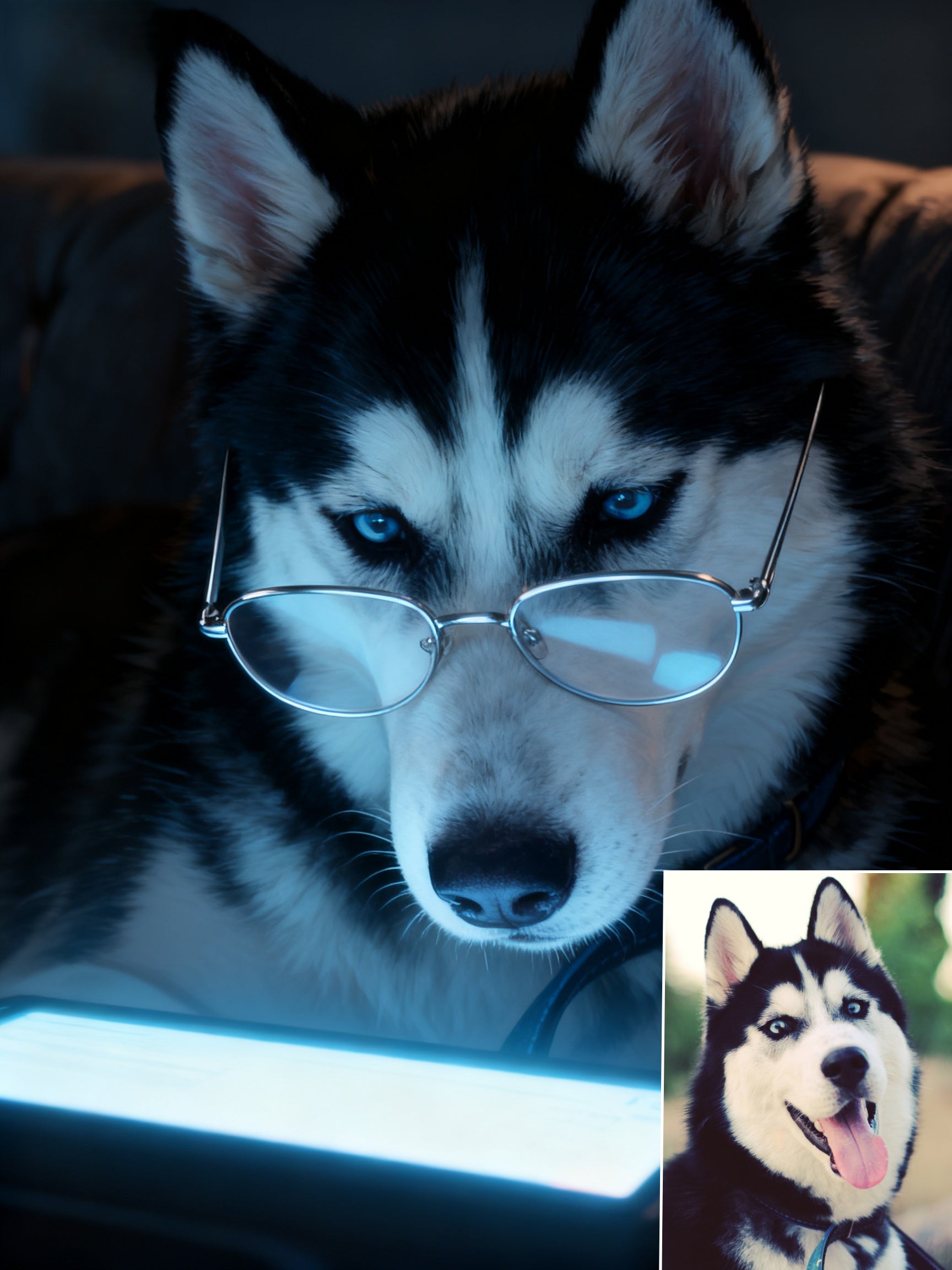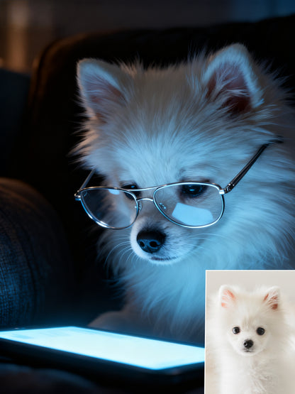 The Digital Scholar Custom Pet Portrait, Intellectual Pet with Glasses & Screen Glow