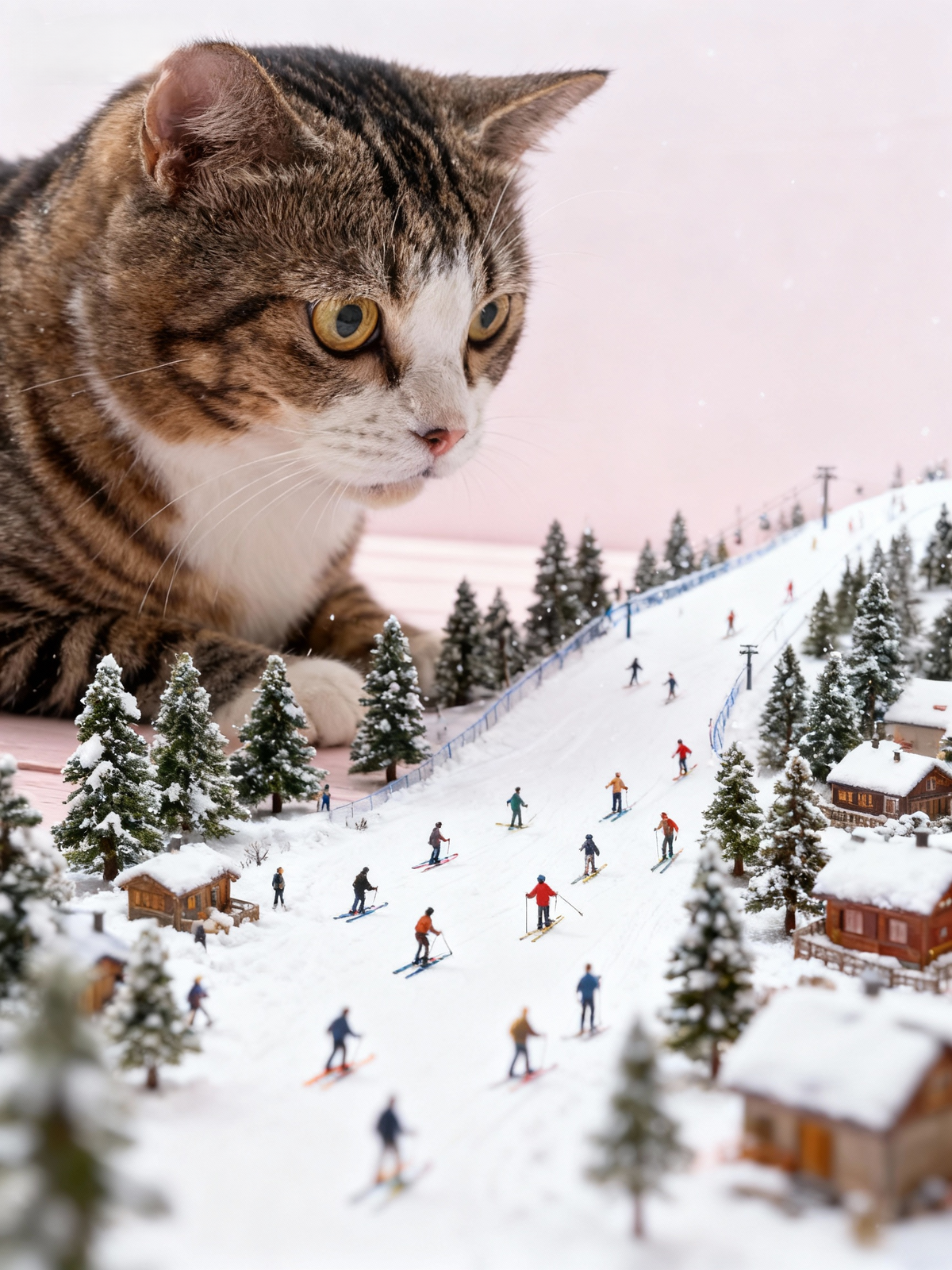 🏔️ The World is Their Playground. Welcome to "The Colossal Ski Adventure" – a portrait that transforms your beloved pet into the gentle giant, the benevolent guardian of a stunning miniature world. This is not just a picture; it’s a cinematic fantasy where scale is warped and wonder is magnified.