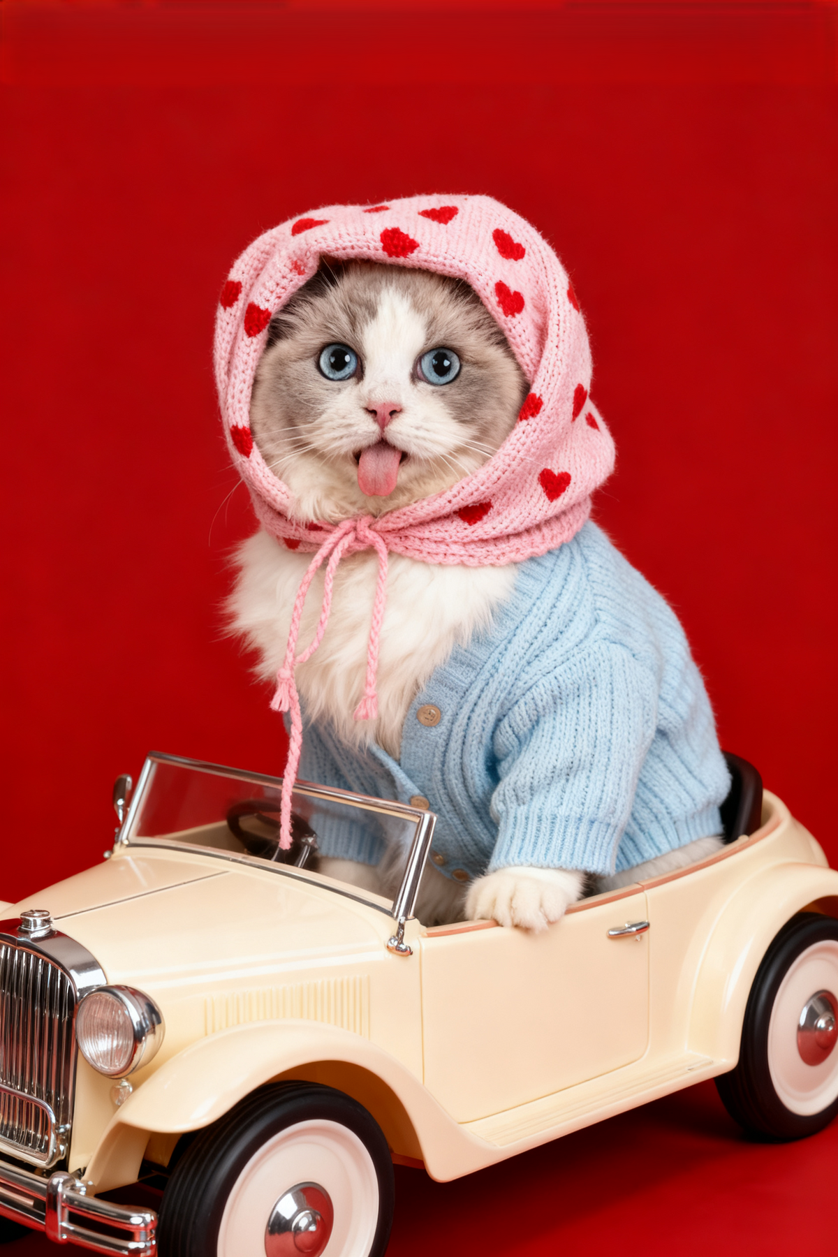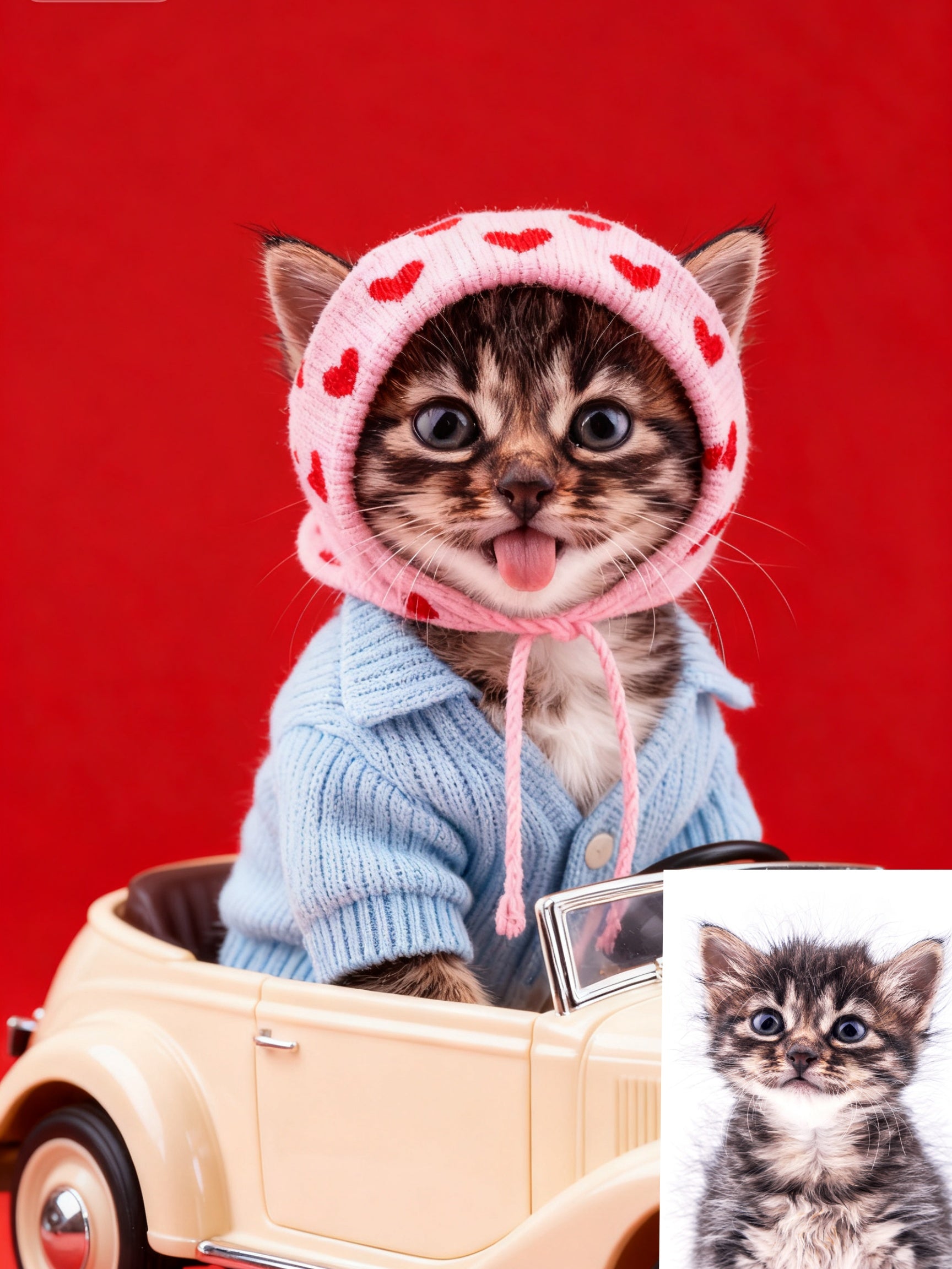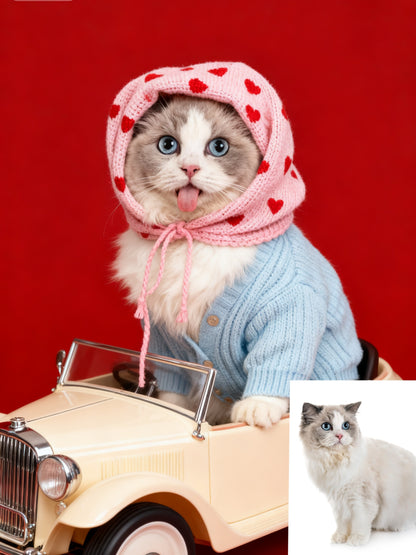 The Love Bug Custom Pet Portrait, Retro Pet in Car with Hearts & Sweater