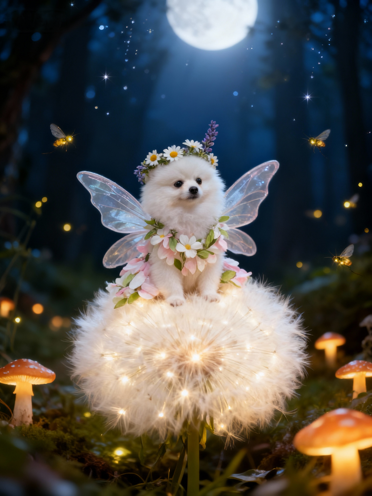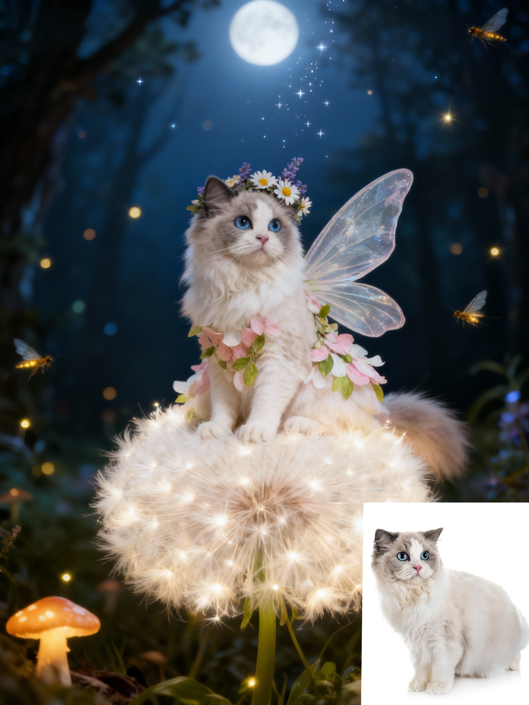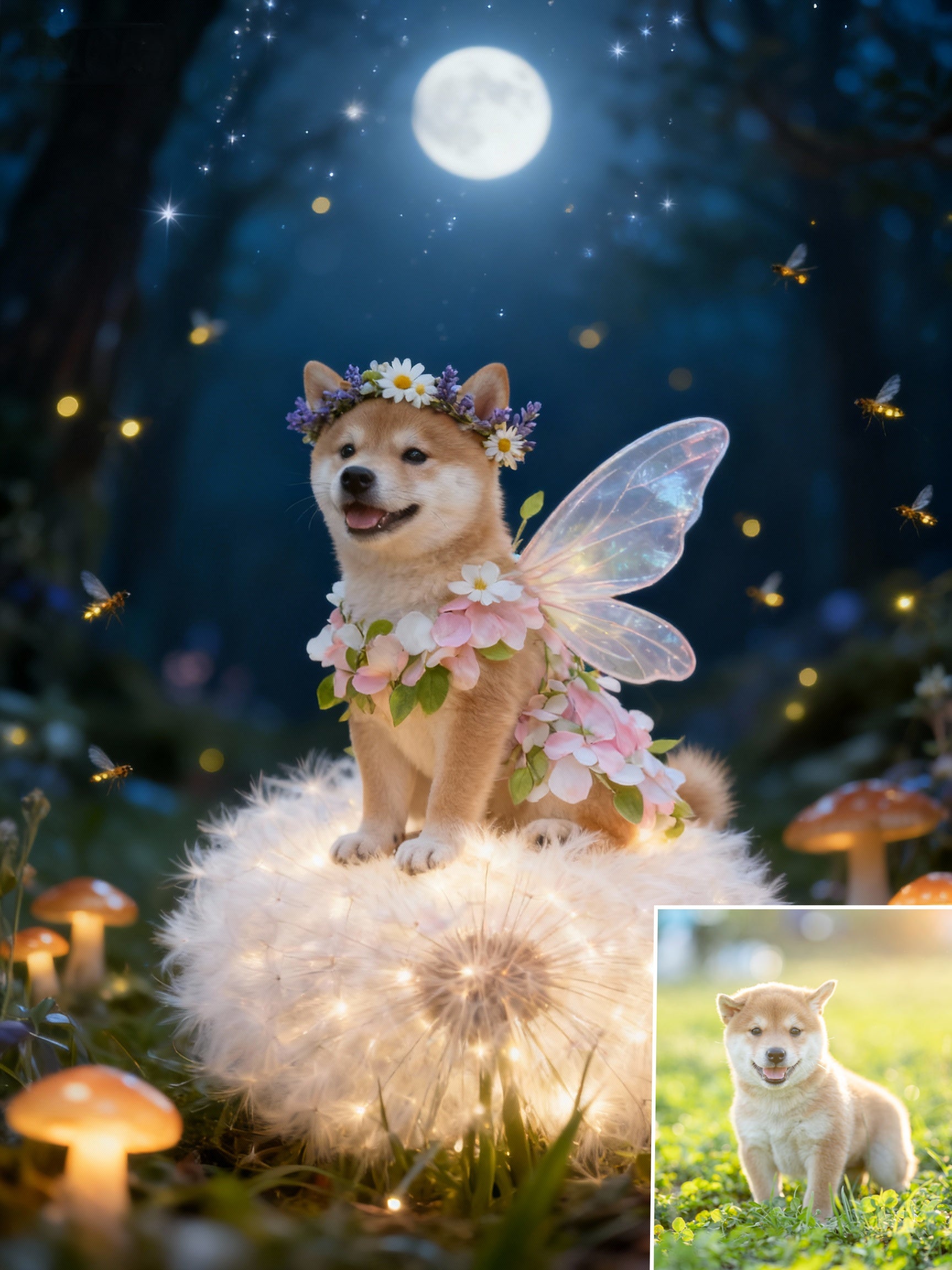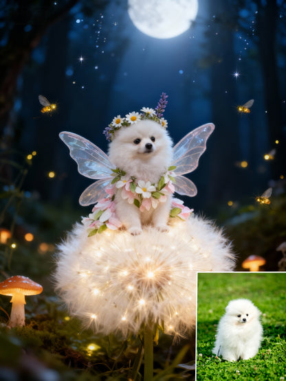 🌙 Unveil the magic of the night. This enchanting portrait places your pet in a secret forest, bathed in the glow of a full moon. Perched on a giant, luminous dandelion and adorned with delicate wings and a flower crown, they become a mystical sprite surrounded by the gentle sparkle of fireflies.