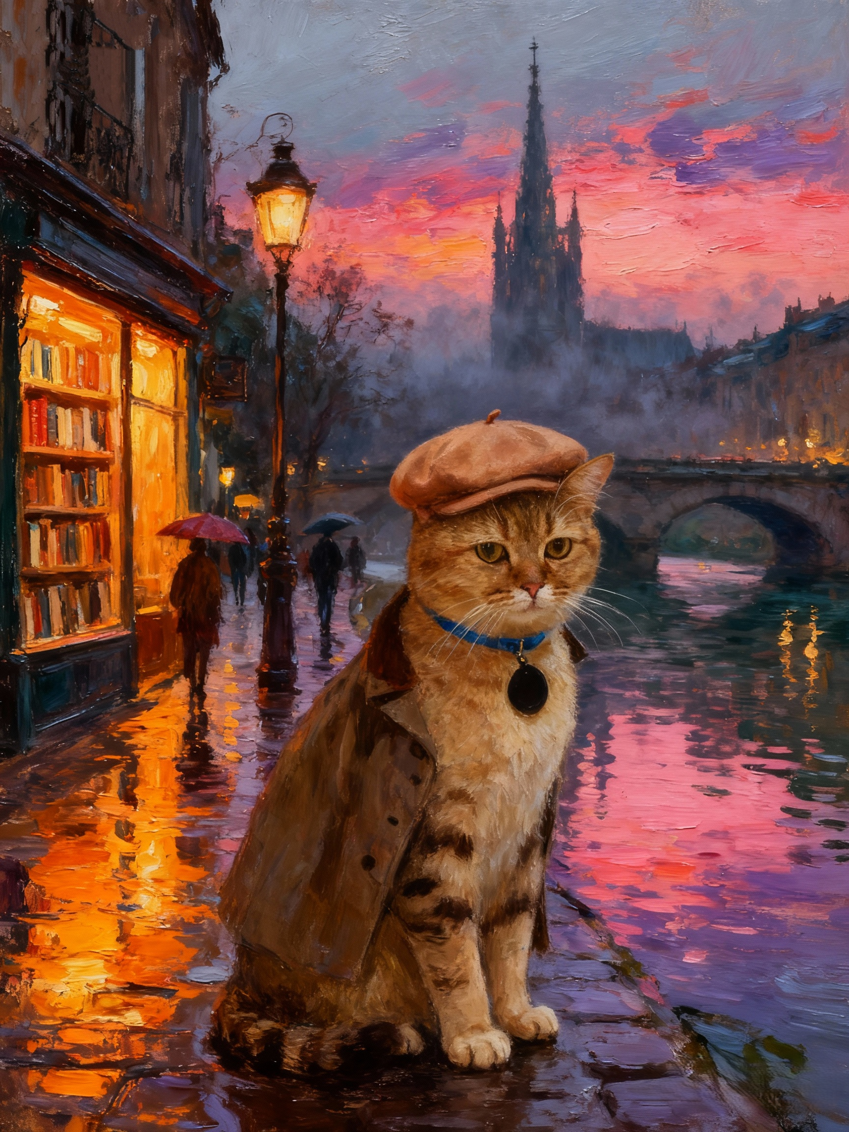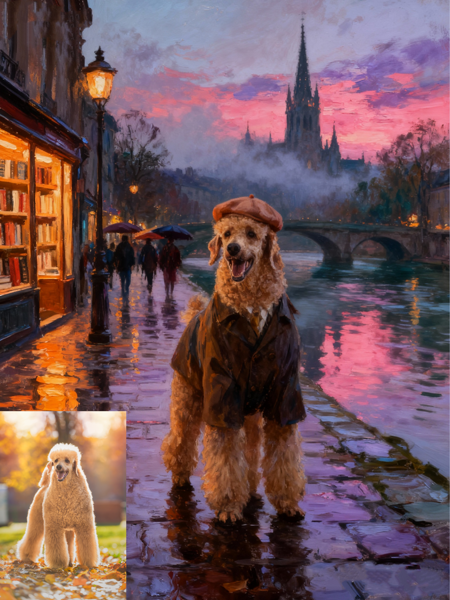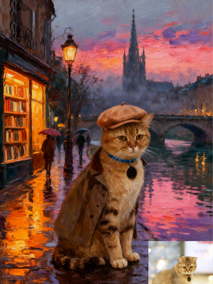 🎨 Imagine your beloved pet as the star of a timeless Parisian scene. This portrait captures them on a romantic evening stroll, with the warm glow of streetlights reflecting on rain-kissed cobblestones. Dressed in a classic beret and coat, your pet becomes a character in their own enchanting story, set against a backdrop of impressionistic beauty and twilight hues.