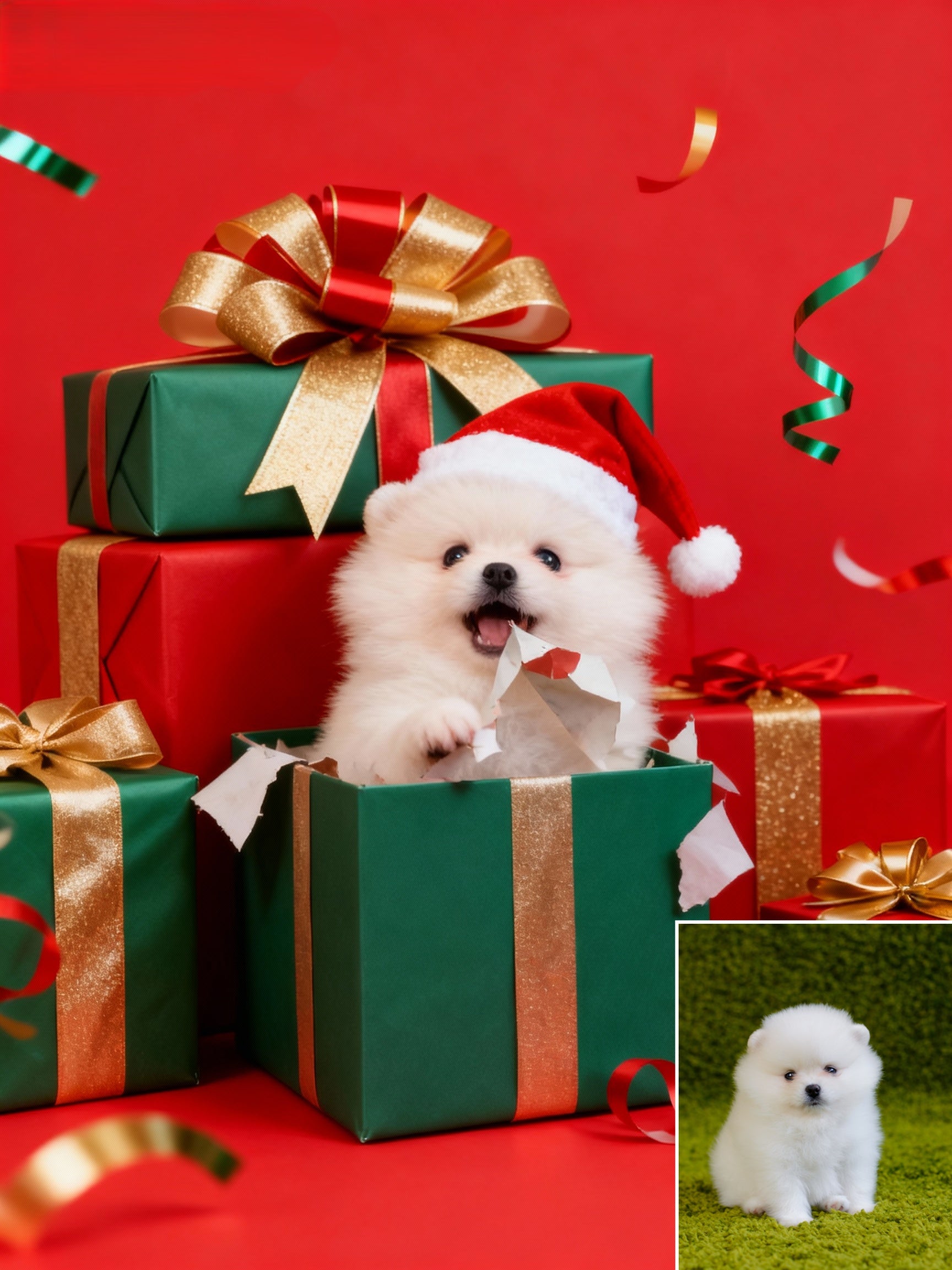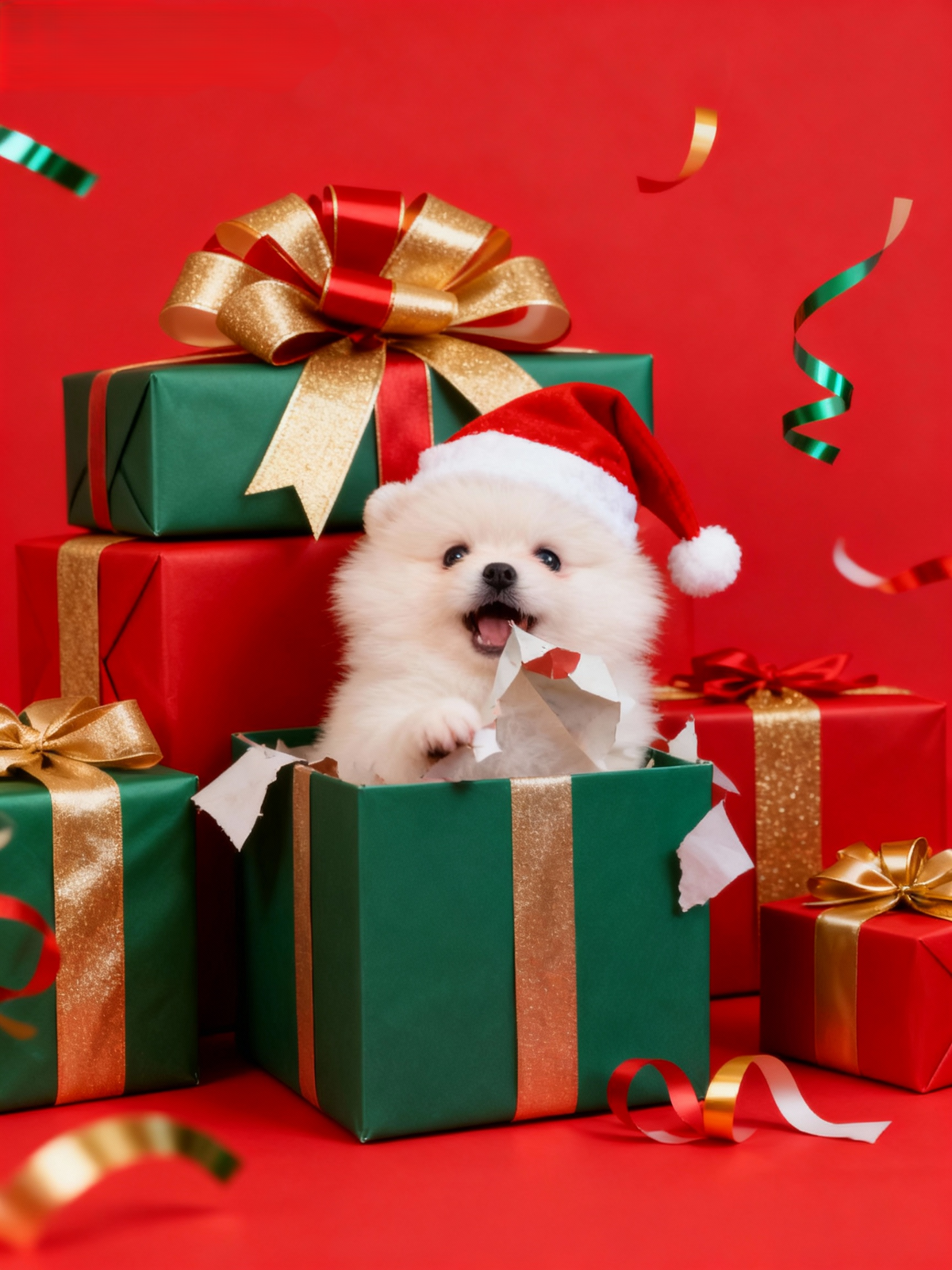 🎁 The best gifts aren't under the tree—they're in it! This joyful portrait captures your pet as the ultimate holiday surprise, popping out of a festive gift box with a cheerful spirit. Wearing a Santa hat and surrounded by a shower of confetti, their happy face is a picture of pure holiday excitement.