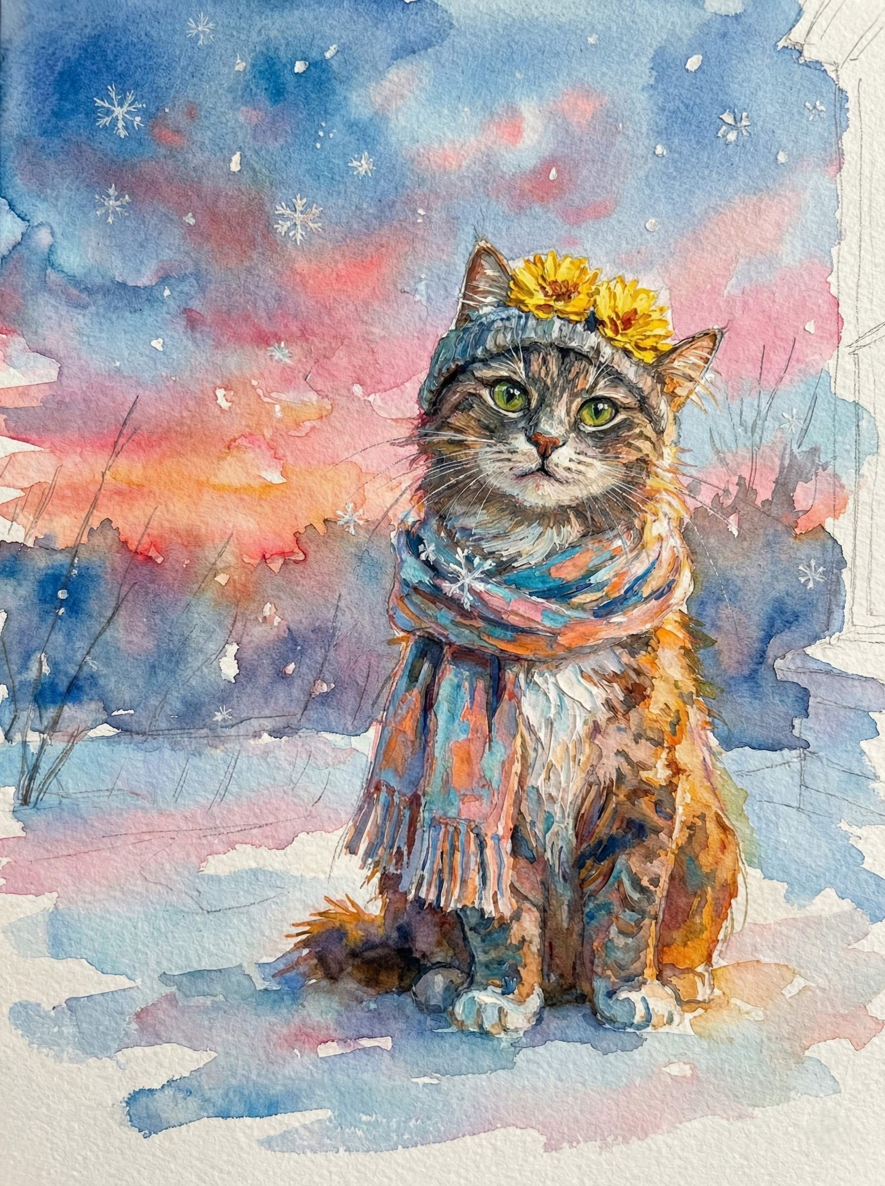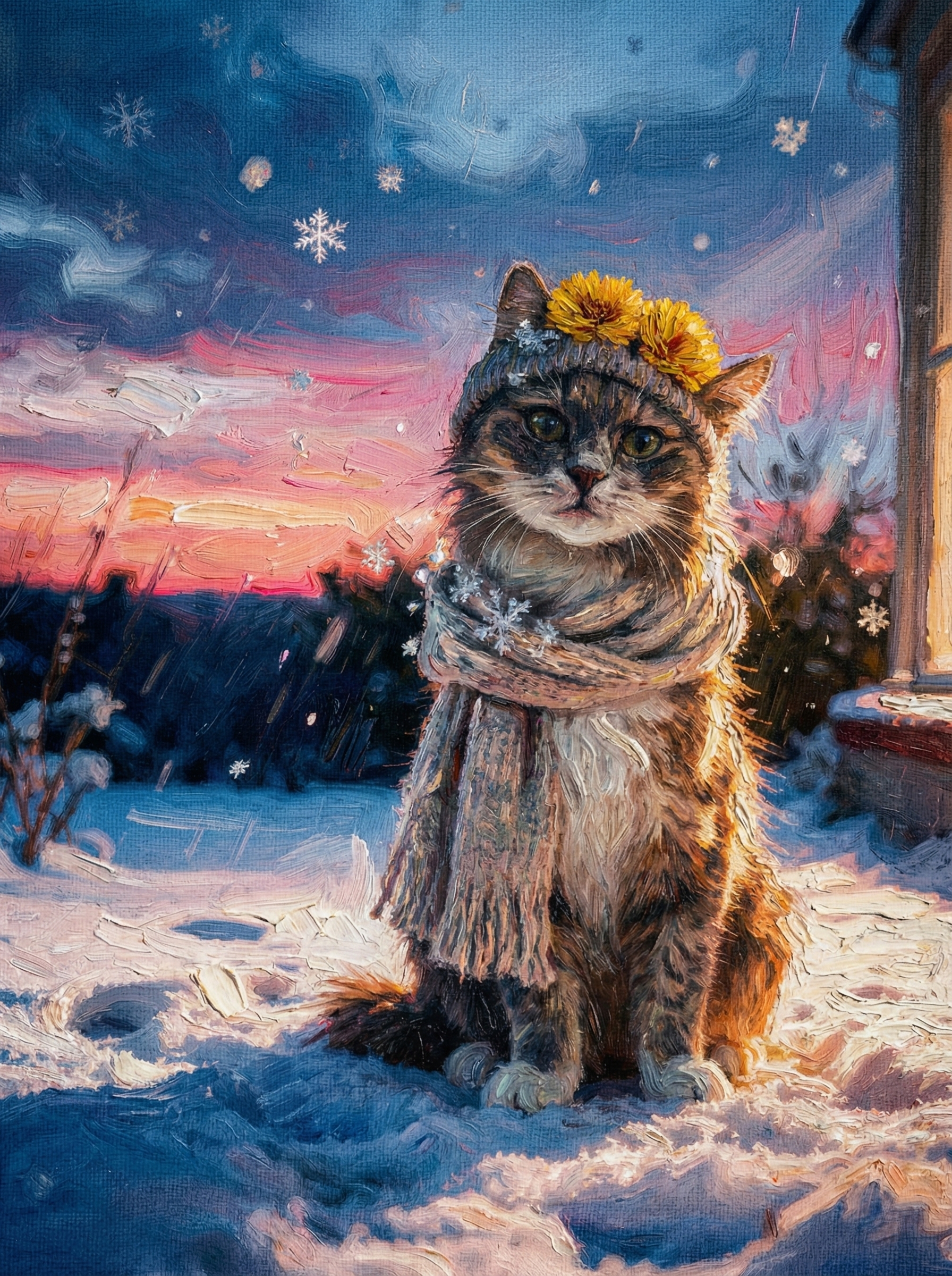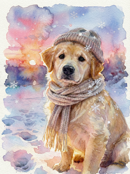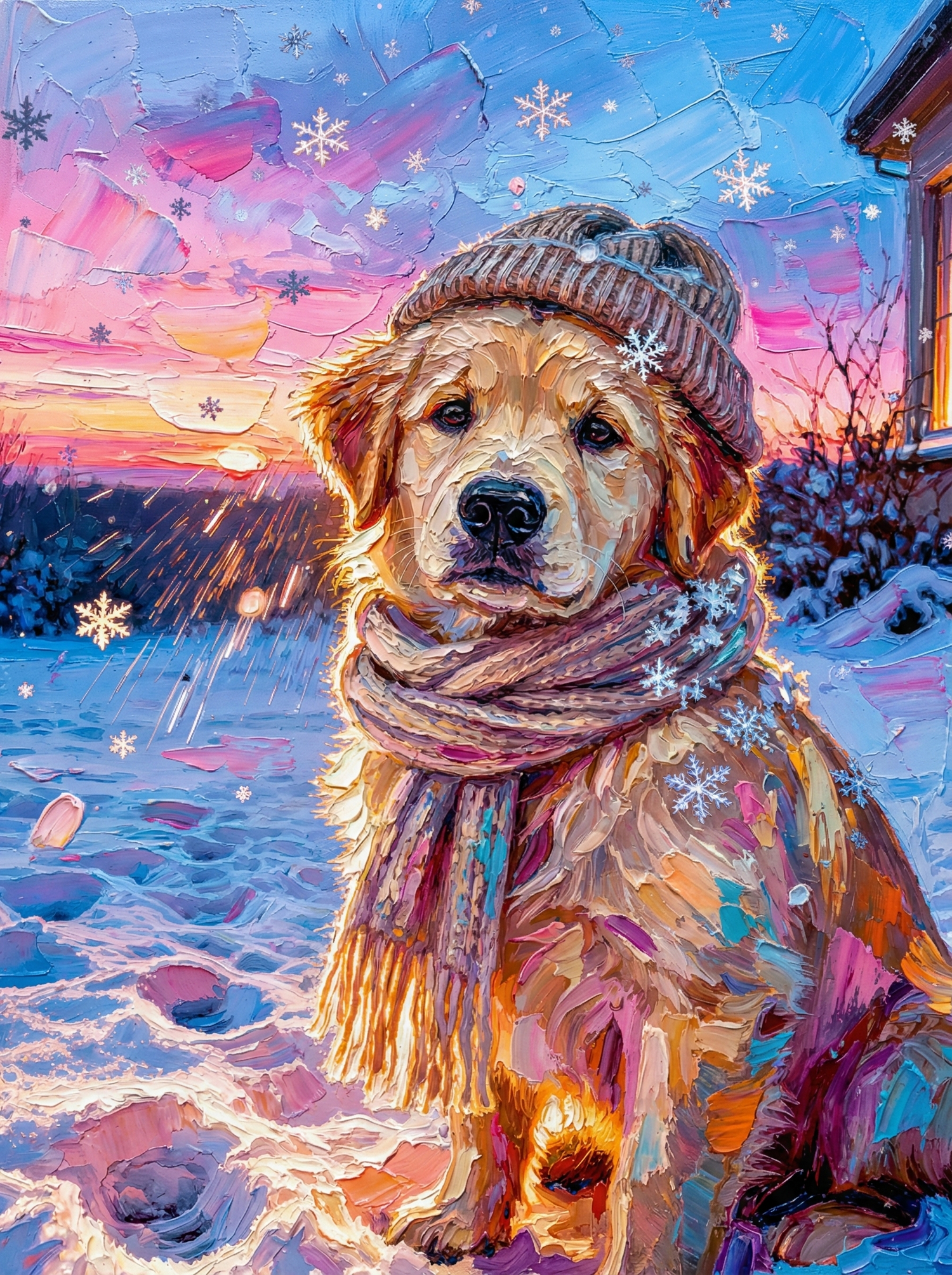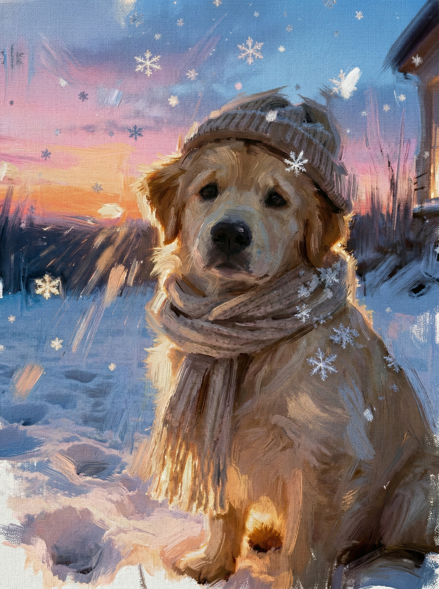 There is a special kind of silence in winter—when the snow dampens the sound of the world, and the sky turns a breathtaking shade of pink and violet at dusk. In this cozy masterpiece, your pet is the heart of that beautiful moment.
