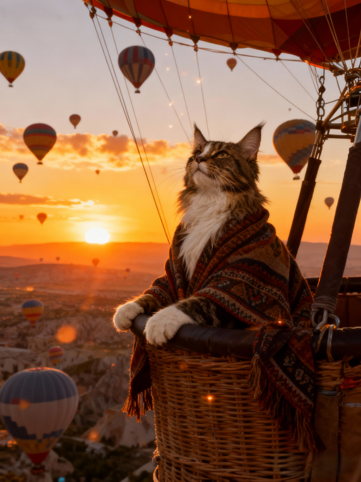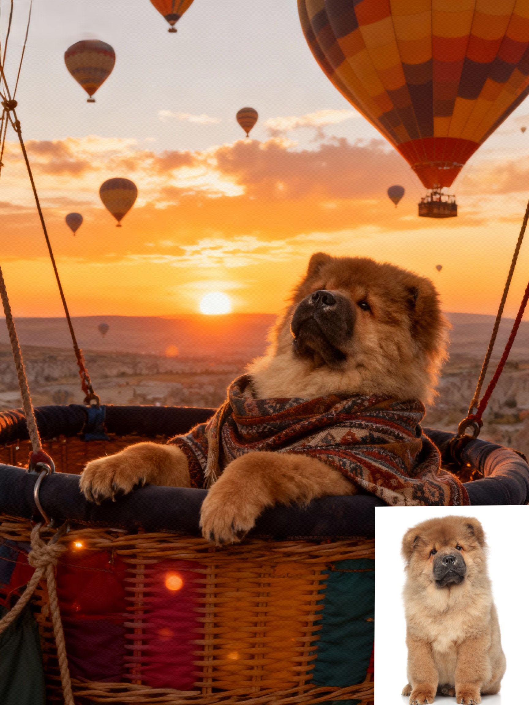 🌅 The World is Waiting. Start the Journey at Sunrise. Elevate your pet's status from companion to connoisseur of the skies. The "Sky Wanderer" portrait captures your beloved dog or cat in the serene, breathtaking moment of a hot air balloon ascent, wrapped in a cozy, patterned shawl.