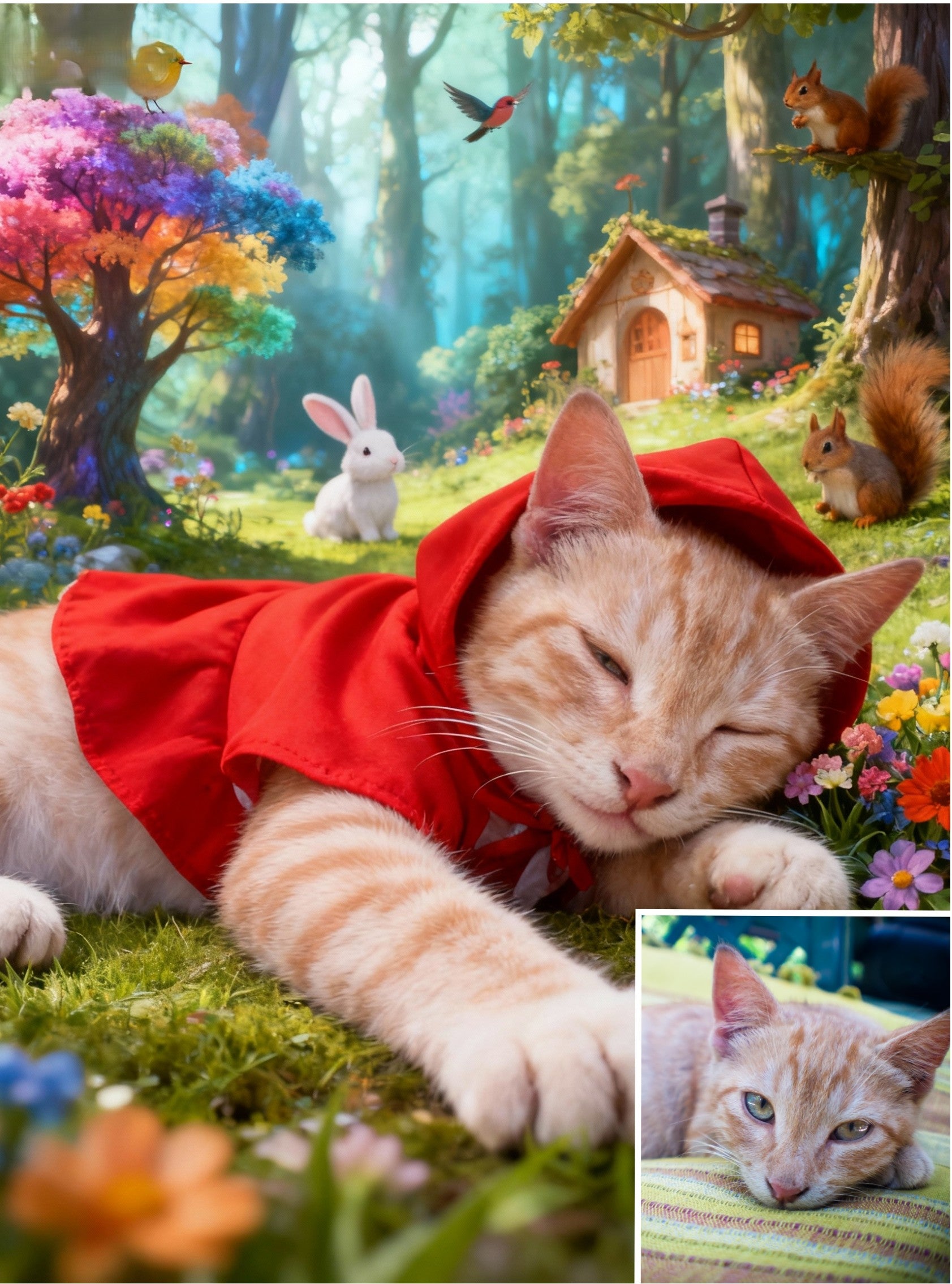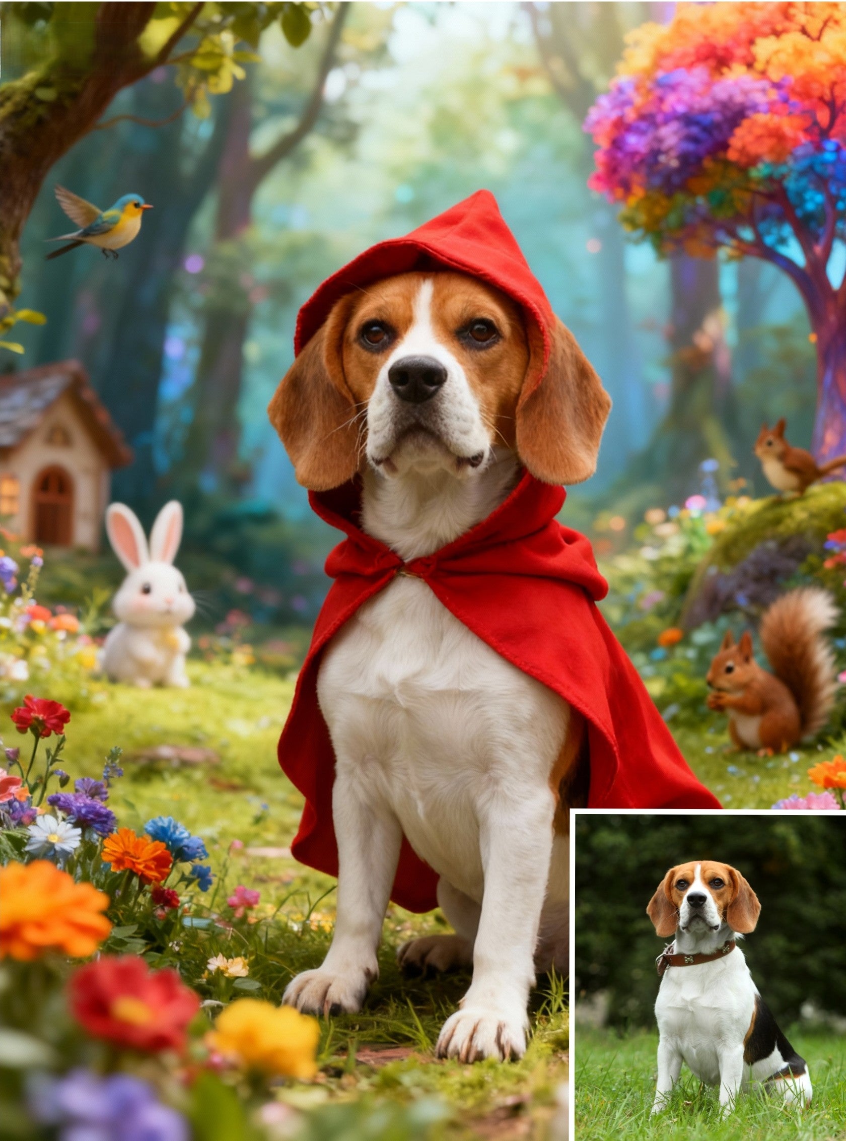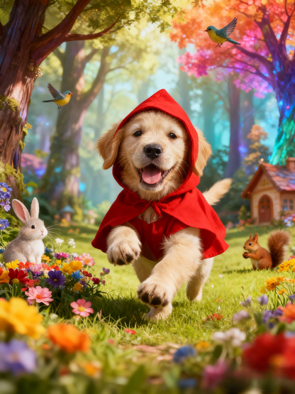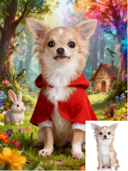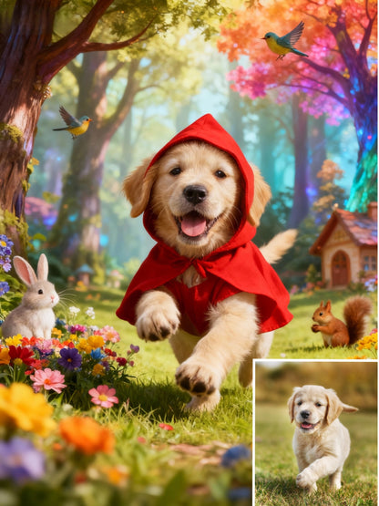 🌲 Step into a fairytale where your pet is the hero. Our "Storybook Adventure" portrait places your beloved companion in a vibrant, enchanted forest, dressed in an iconic red cloak. Surrounded by friendly woodland creatures and colorful blossoms, it's a scene straight out of a cherished children's book.