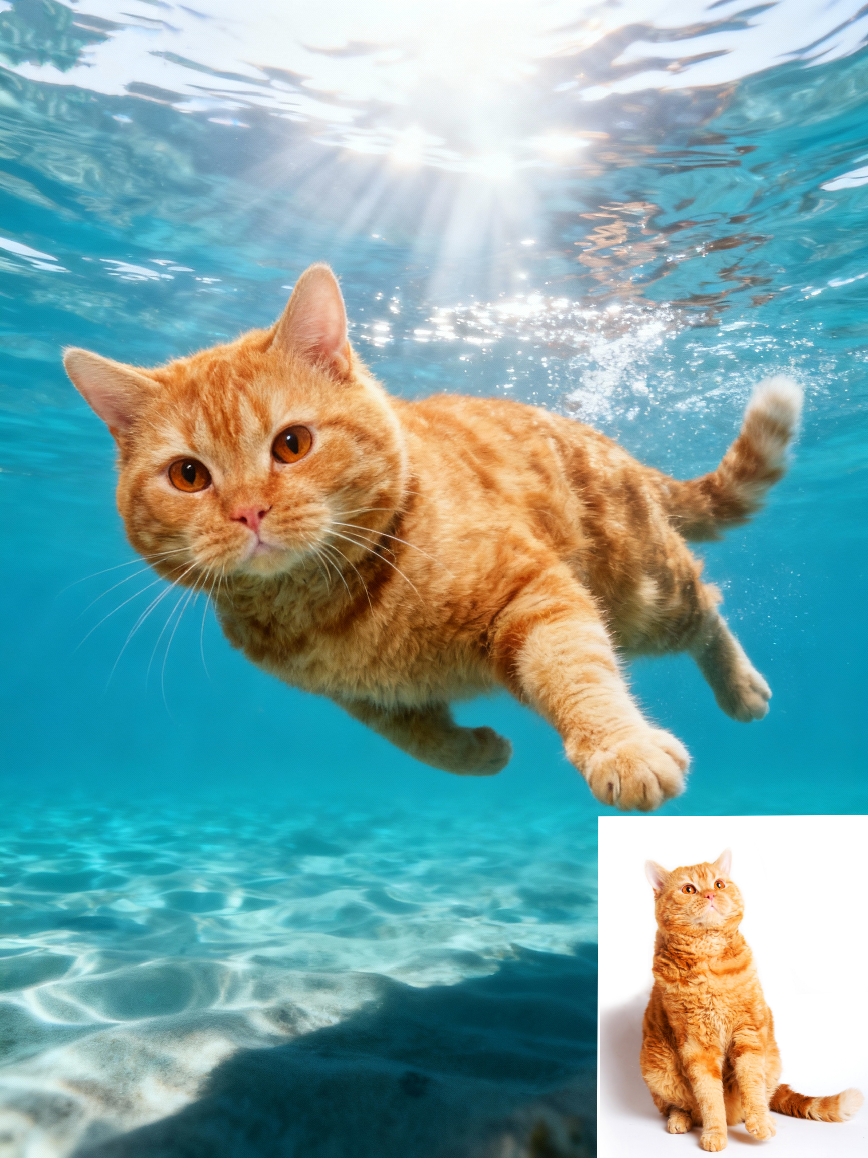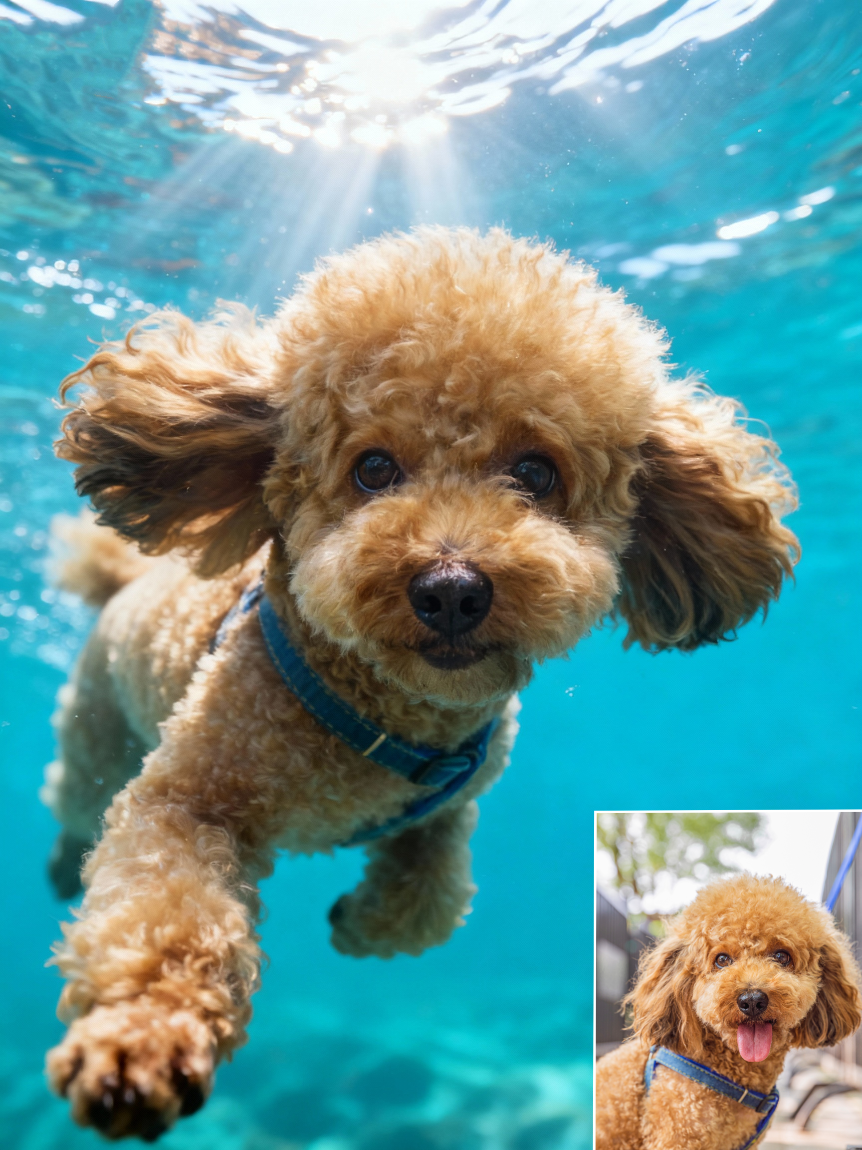 🌊 Dive into an ocean of adventure! This stunning portrait captures your pet exploring the crystal-clear depths, with sunbeams dancing through the water. It’s a vibrant, action-packed scene that showcases their playful and fearless spirit, turning them into a true underwater explorer.