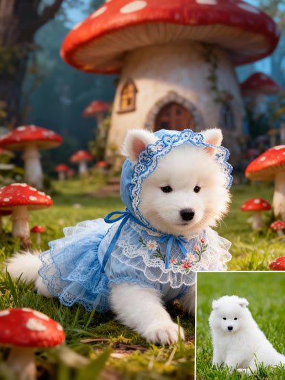 Wonderland Explorer Pet Portrait | Custom Fairy Tale Mushroom Forest Art | Blue Lace Dress & Bonnet